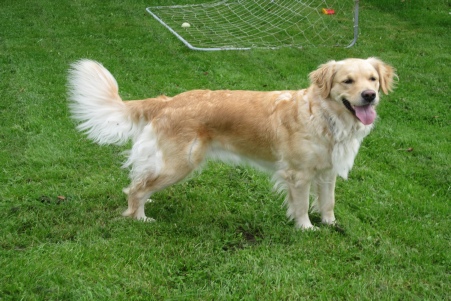 Her er en af vores hunde, ”Sille”. Hun er en super god hund og meget glad. Om dagen er hun lukket væk fra børnene, men vi hilser på hende en gang i mellem og så er hun en fantastisk ”støvsuger”.